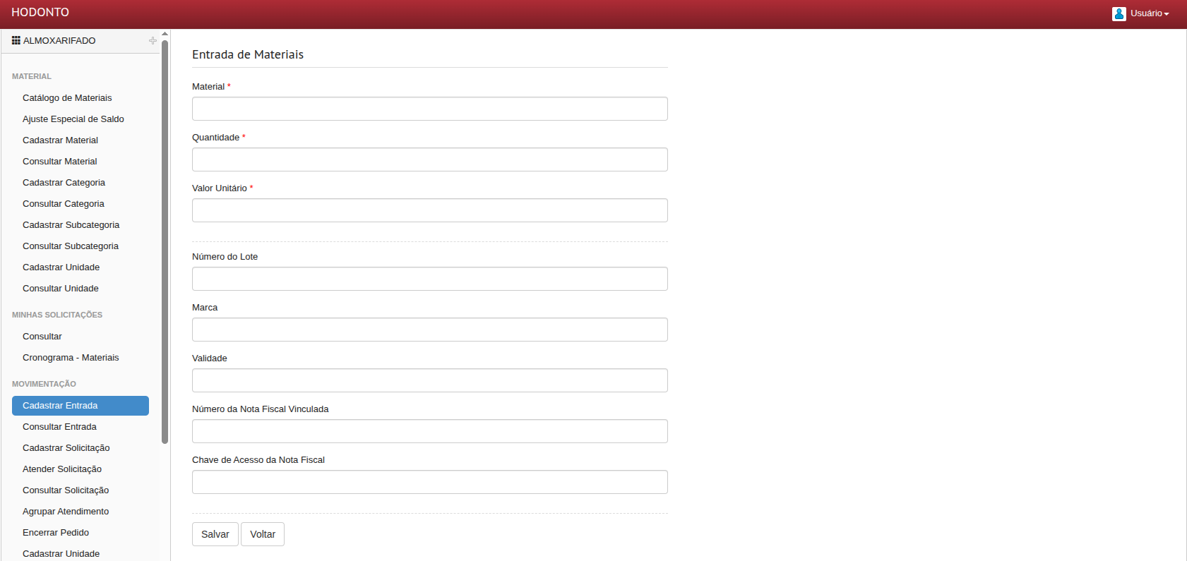 O usuário gestor pode cadastrar novas entradas de material no sistema, sendo necessário informar os campos obrigatórios: material, quantidade e valor unitário. Os demais campos são de preenchimento opcional, mas permitem um maior nível de detalhamento da entrada. Após preencher os campos clicar no botão “Salvar” para finalizar o cadastro.
