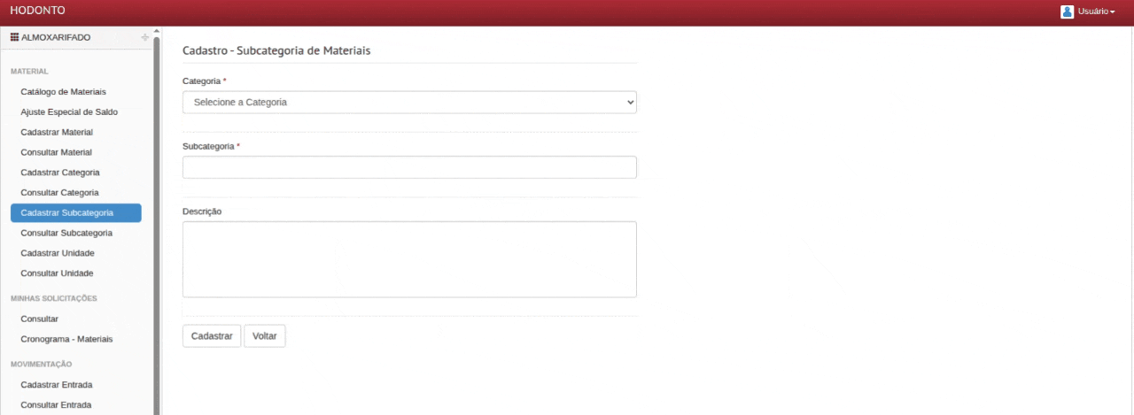 O usuário gestor pode cadastrar novas subcategorias. Para isso, basta escolher a categoria no menu correspondente, digitar o nome e descrição e clicar em “Cadastrar”.