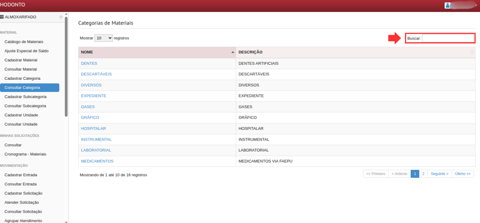 Nessa seção o usuário gestor pode realizar a consulta e edição de categorias previamente cadastradas. Para encontrar uma categoria específica, o usuário deve utilizar a caixa de busca localizada no canto superior direito e pesquisar o termo desejado: