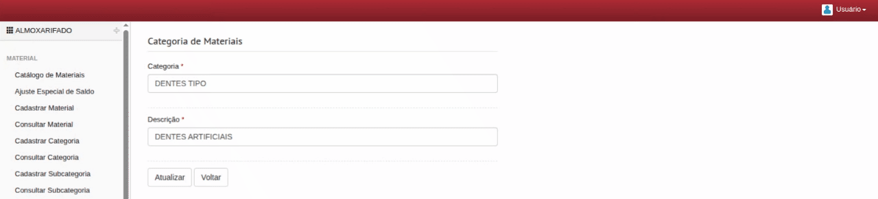 Dentro da seção que detalha a categoria, é possível realizar a edição do nome e de sua descrição por meio dos campos de texto. Após realizar as alterações, selecione a opção ATUALIZAR para efetuar as mudanças: