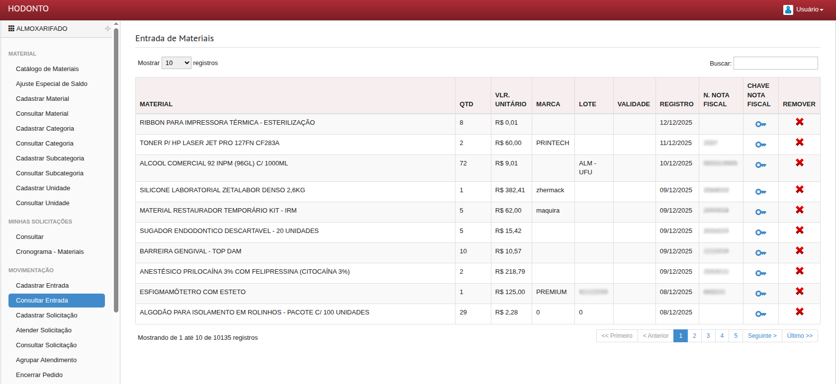 O usuário gestor pode consultar todas as entradas de material cadastradas no sistema, juntamente com os dados de Nota Fiscal relacionados, a data, quantidade e preço.
