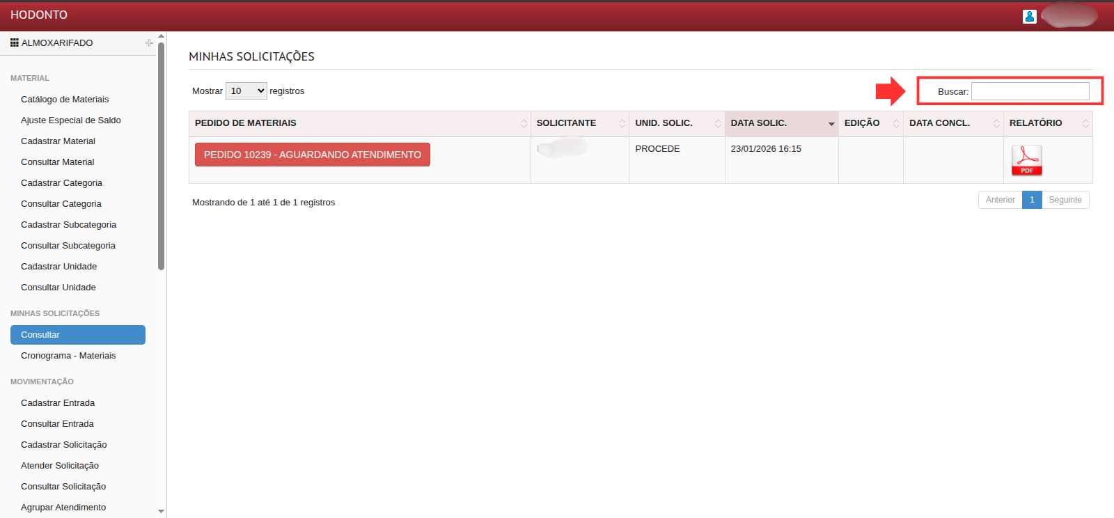 Caso deseje encontrar um registro específico, o usuário solicitante pode realizar a busca das solicitações utilizando a ferramenta de filtragem. Para isso, clique na barra de pesquisa no canto superior direito e digite o nome da sua solicitação: