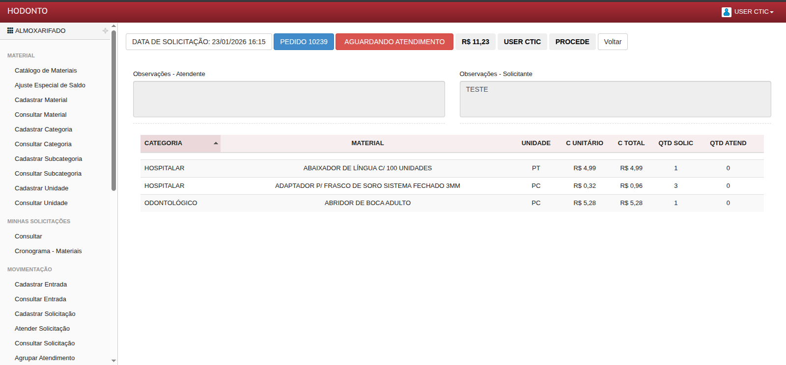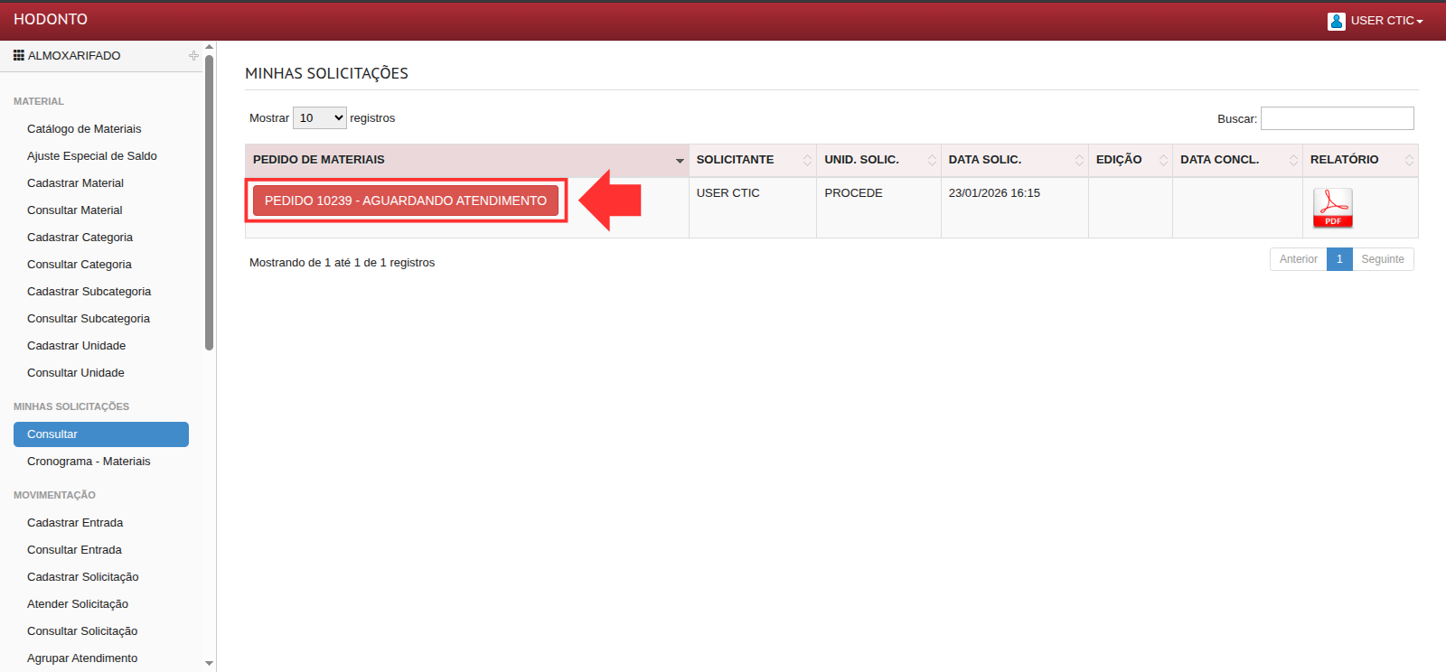 Clique no pedido da solicitação para visualizar os detalhes da mesma: