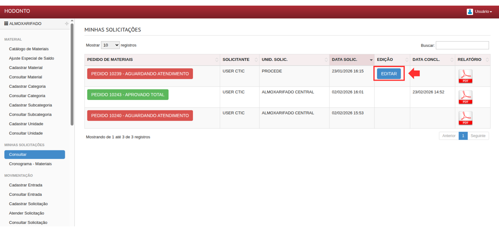 Nesta seção, o usuário solicitante pode realizar a edição de suas solicitações. Para que o solicitante consiga realizar alterações, é necessário que o gestor autorize previamente a edição na página Atender Solicitação. Uma vez autorizado, o botão azul EDITAR ficará disponível na coluna “EDIÇÃO” da lista de solicitações: