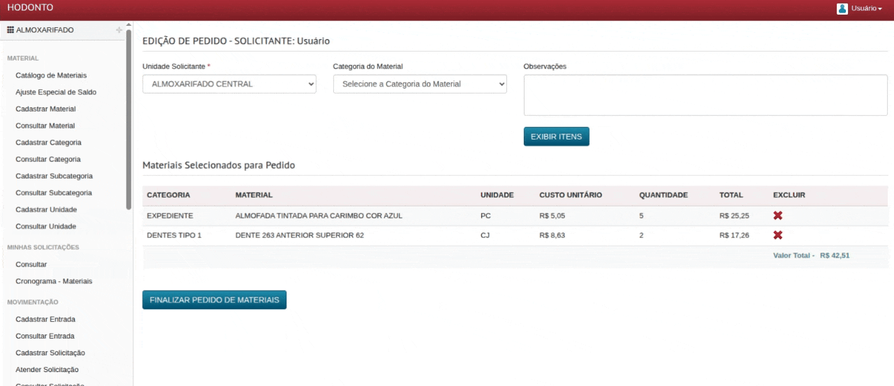 Ao finalizar todos os ajustes, o usuário deve clicar em FINALIZAR PEDIDO DE MATERIAIS para salvar as alterações.