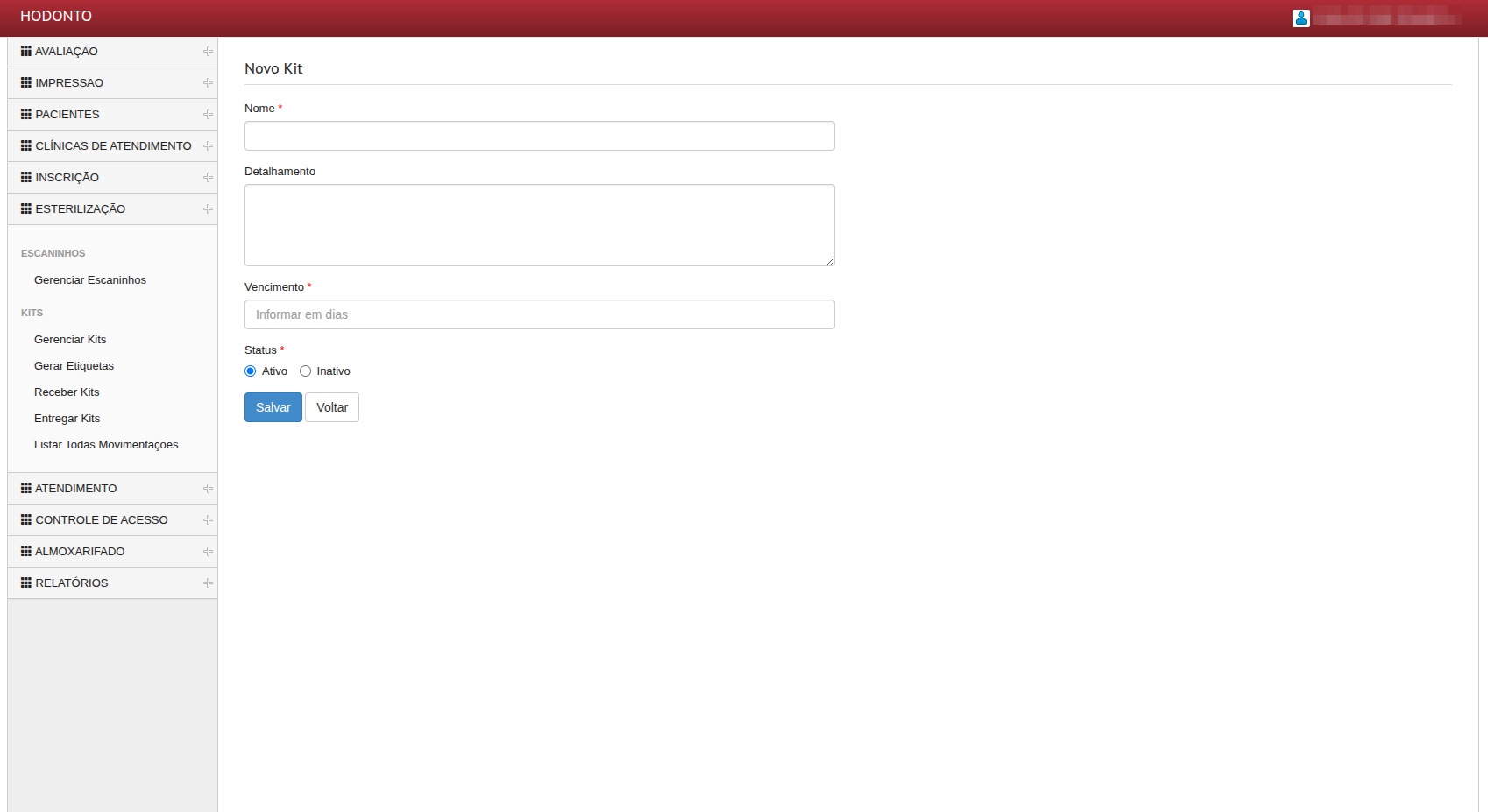 Tela de cadastro de kit