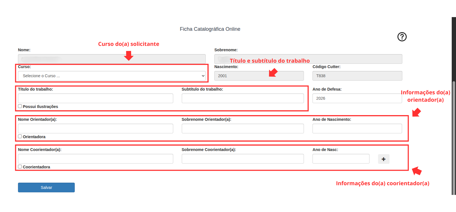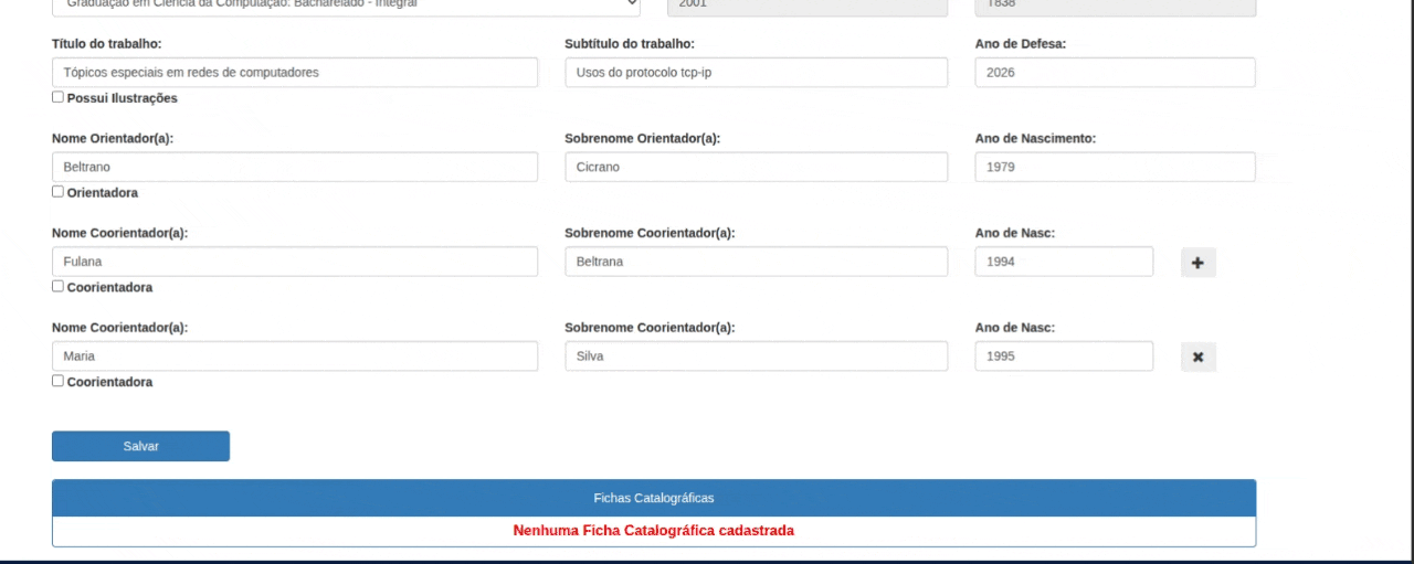 Na tela de geração da Ficha, é preciso selecionar o curso, preencher o título do trabalho, se contém ilustrações, subtítulo do trabalho, ano de defesa e informações sobre o(a) orientador(a), podendo adicionar coorientadores(as) se for o caso. O código Cutter é gerado automaticamente.