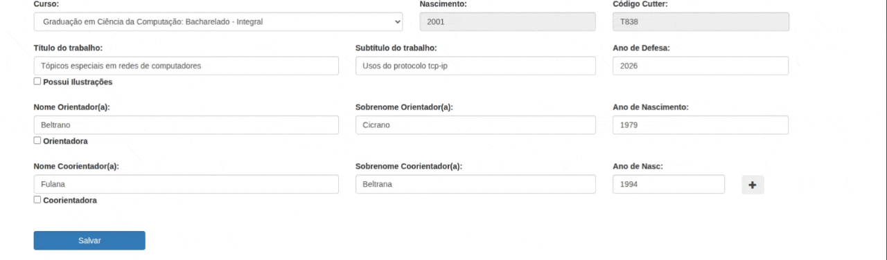 Para adicionar mais de um(a) coorientador(a), clique no ícone + ao lado dos dados e preencha a nova linha como as demais.